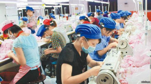 過去五年中國藍領工人的工資幾乎增加了一倍(廣西一家工廠內女工在加工外銷針織品)