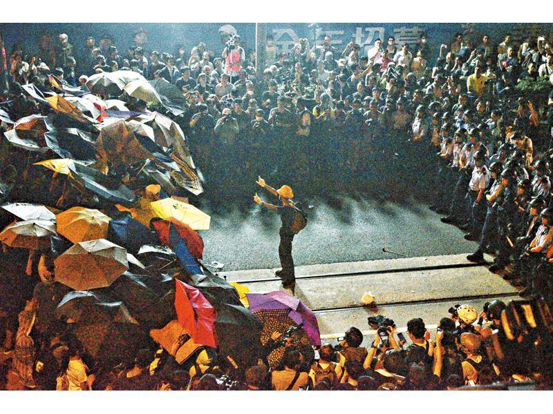 到了晚上約9時,有示威人士改到德輔道西西行線聚集,並以三色回收箱、垃圾桶、鐵馬等雜物設置路障,癱瘓四條行車線,電車亦無法通行,機動部隊於是再次舉起紅旗及多次施放胡椒噴霧,企圖驅散示威群眾,示威者立即架起「雨傘陣」抵擋,有機動部隊成員立即搶走雨傘。