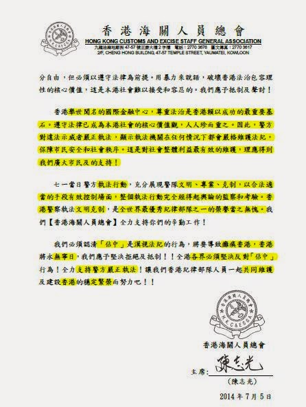 Hong Kong Customs & Excise Staff General Association's statement? Or Wen Wei Po's editorial?On July 7, 2014, the Hong Kong Customs & Excise Staff General Association issued a statement in support of the police's handling of the sit-in protest in Central which ran from the night of July 1 till the morning of the following day. A comparison of this statement with an editorial of the pro-Beijing Wen Wei Po newspaper on July 3 shows that the two texts are extremely similar. The text highlighted in yellow in the images below show the wording which appear in both texts.